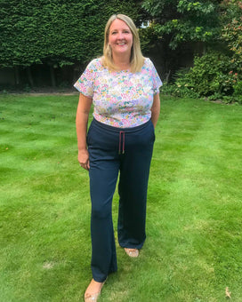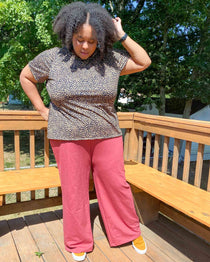 Versatile knit pants sewing pattern with an ultra-comfortable waistband, drawstring, and deep pockets.