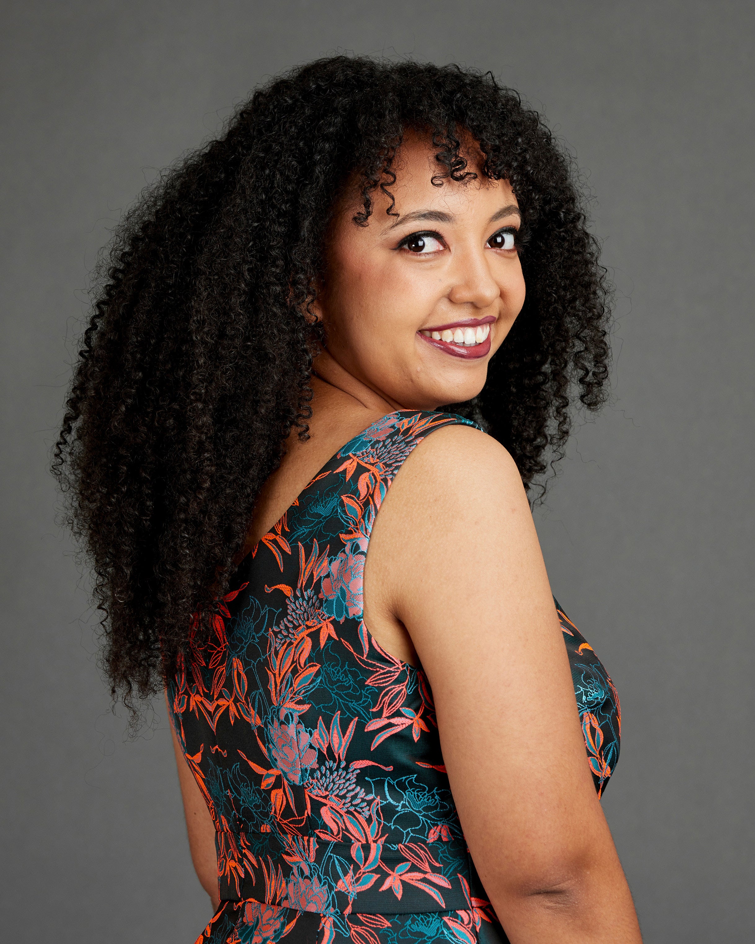 Ayelet (white) is wearing a size 14 G/H. Her measurements are high bust 39", full bust 43.5", waist 34", hip 46", and she is 5' 4”.