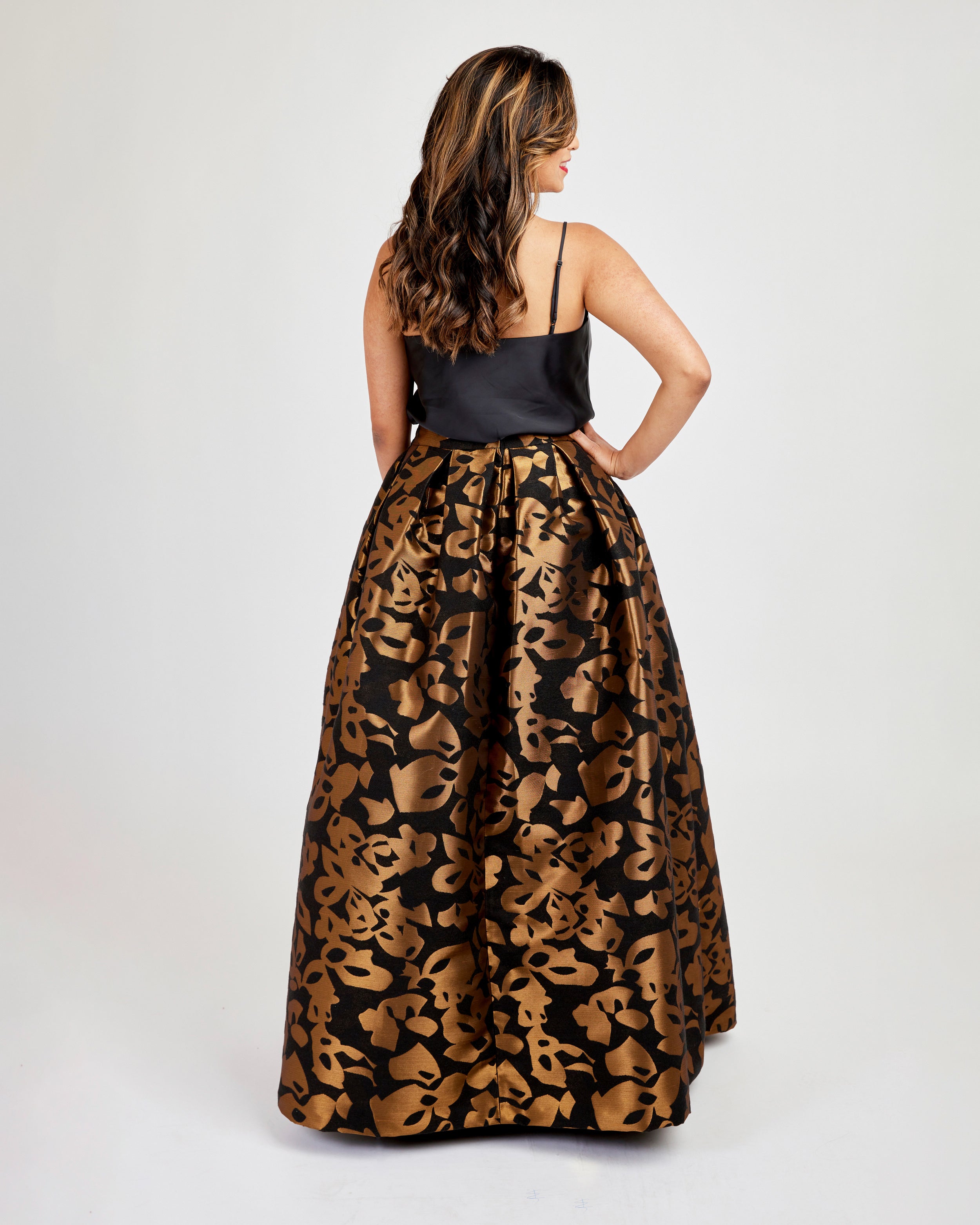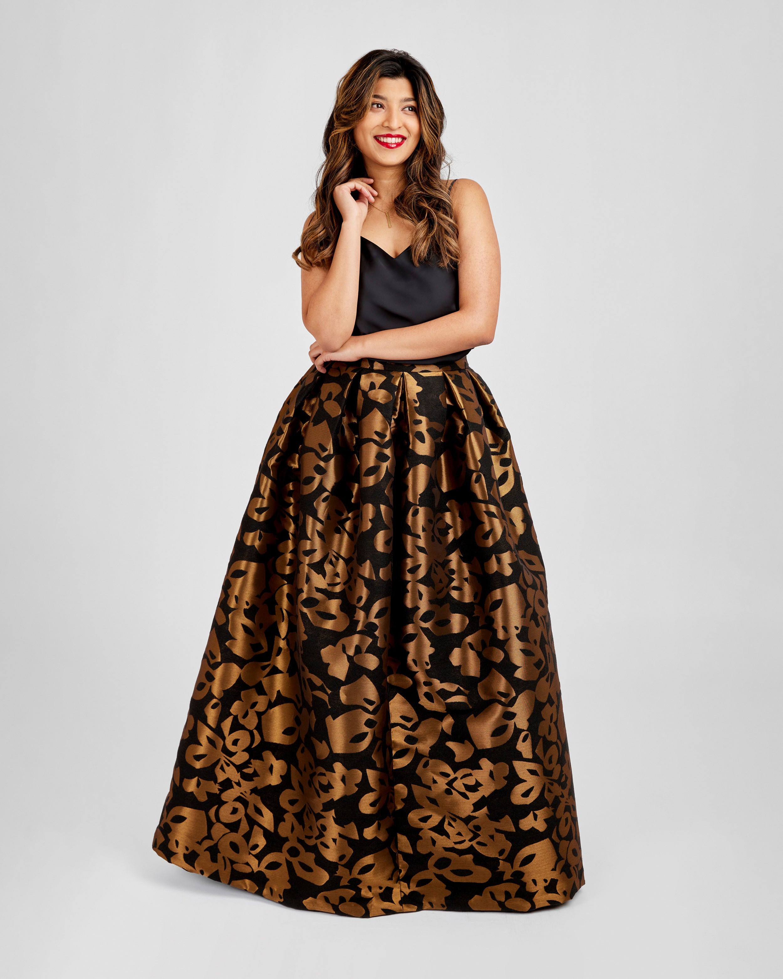 Rachel (floral skirt & gold) is wearing a size 16 G/H. Her measurements are high bust 41", full bust 46", waist 36.5" and hip 49.5". She is 5' 5”.
