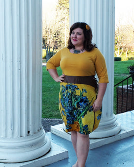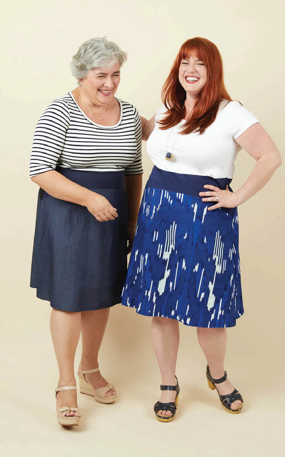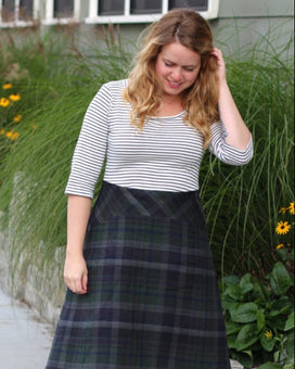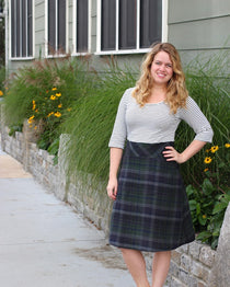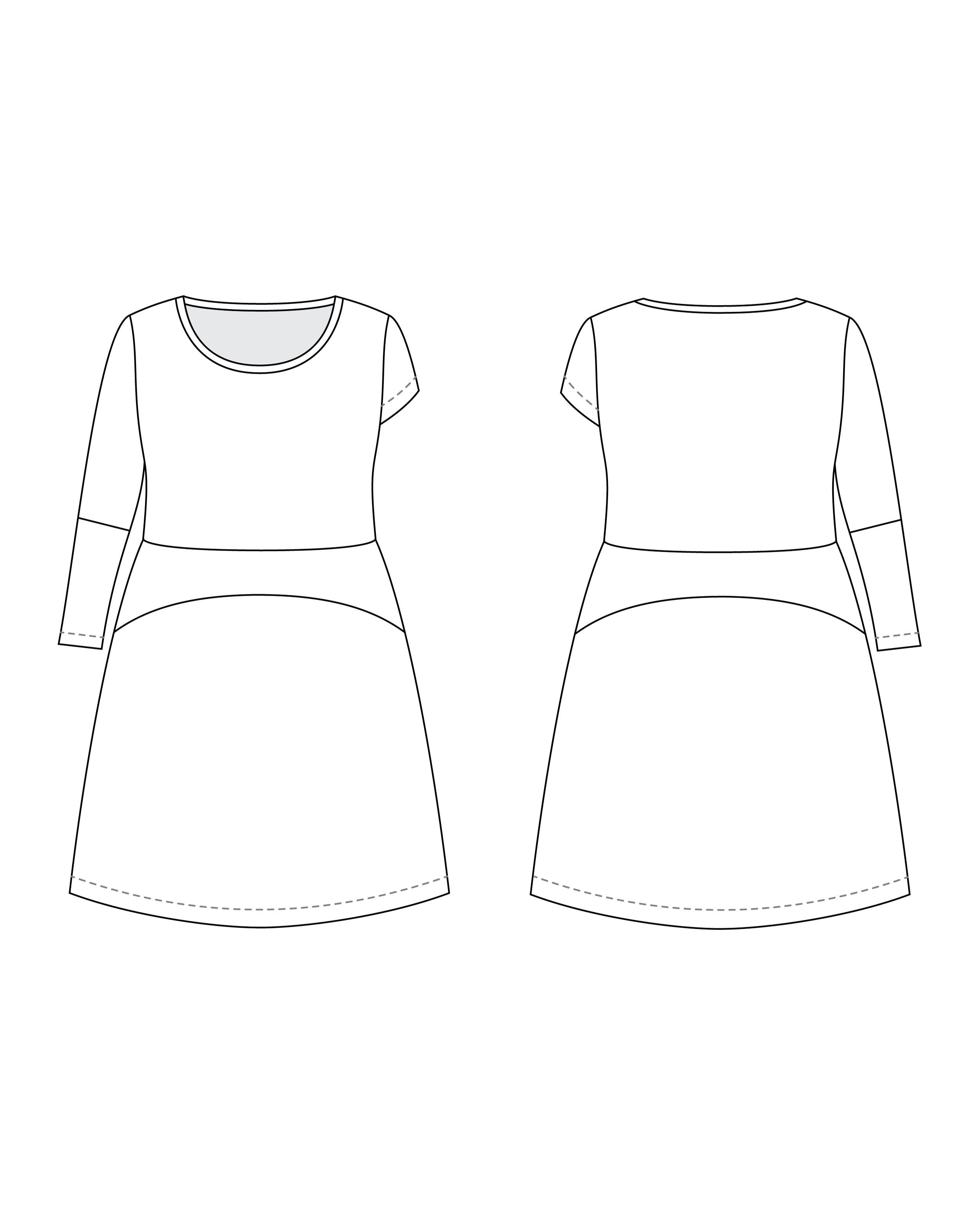 Style wise, the Washington Dress gives you endless design options. The knit bodice features a figure-enhancing scoop neckline and three sleeve variations: short, three-quarter, or full length. The A-line skirt cleverly combines woven fabric with a heavy knit yoke, eliminating the need for closures and allowing you to comfortably slip the dress over your head. For additional tummy control, the front yoke can be made from a woven fabric.