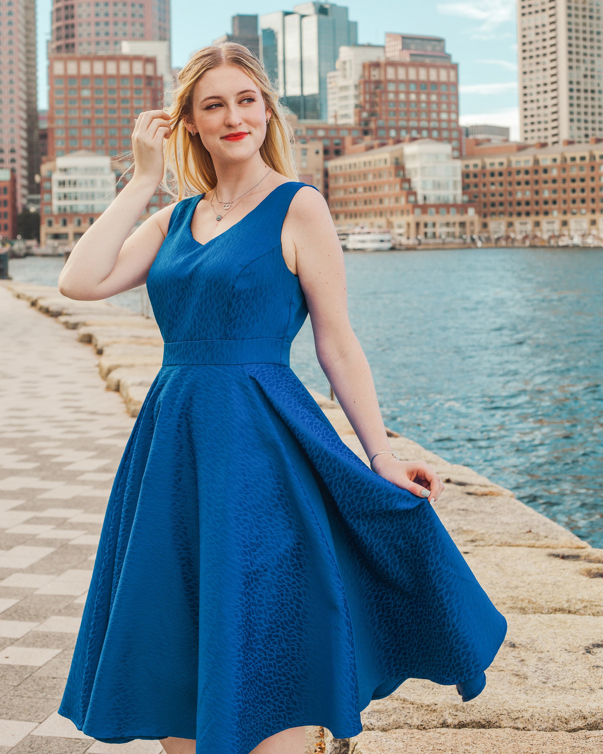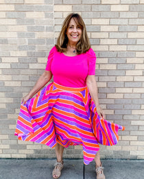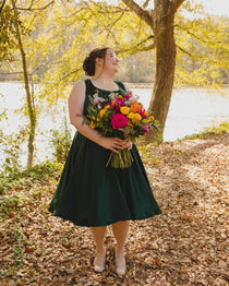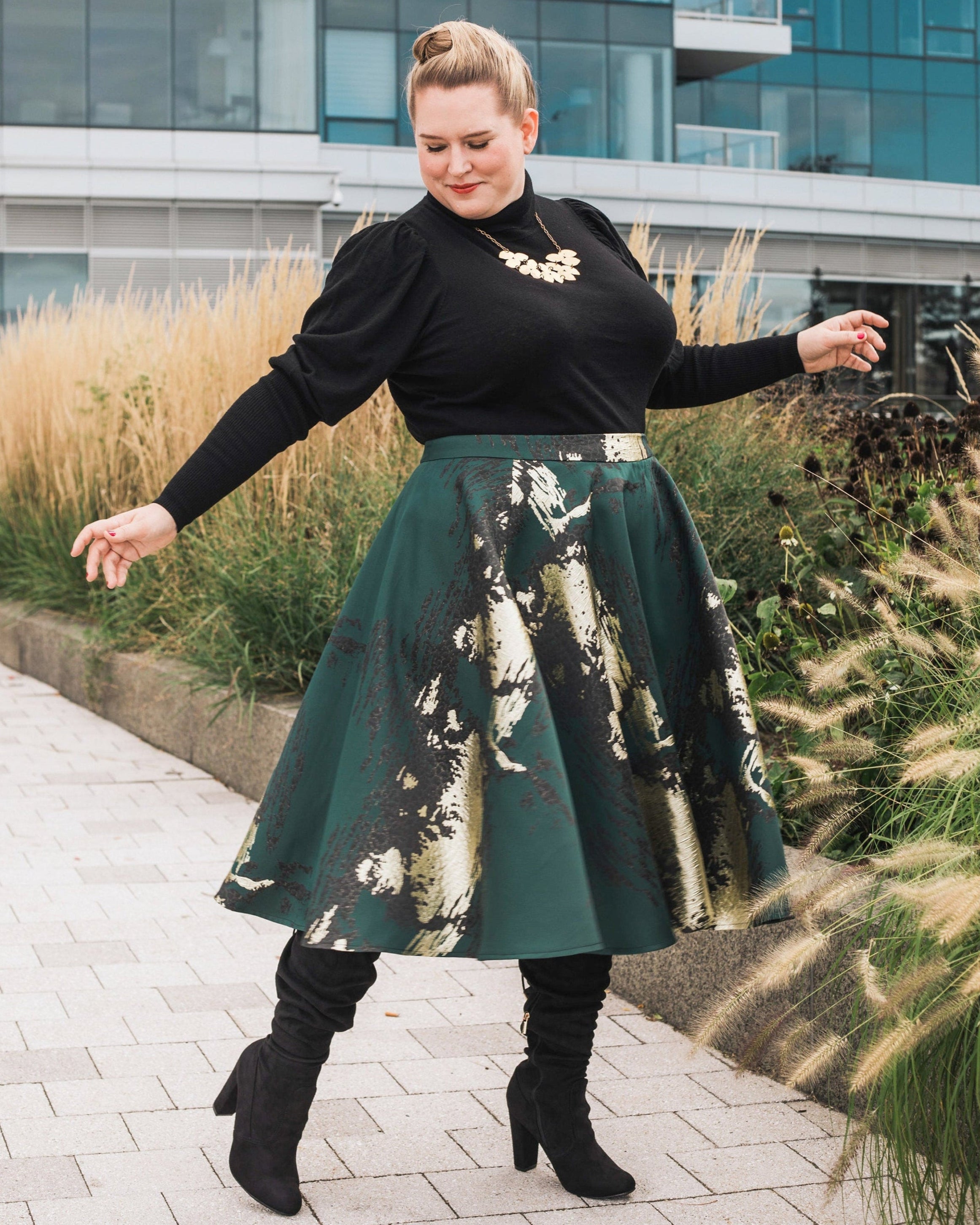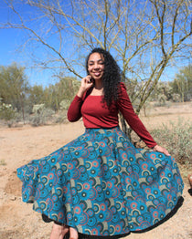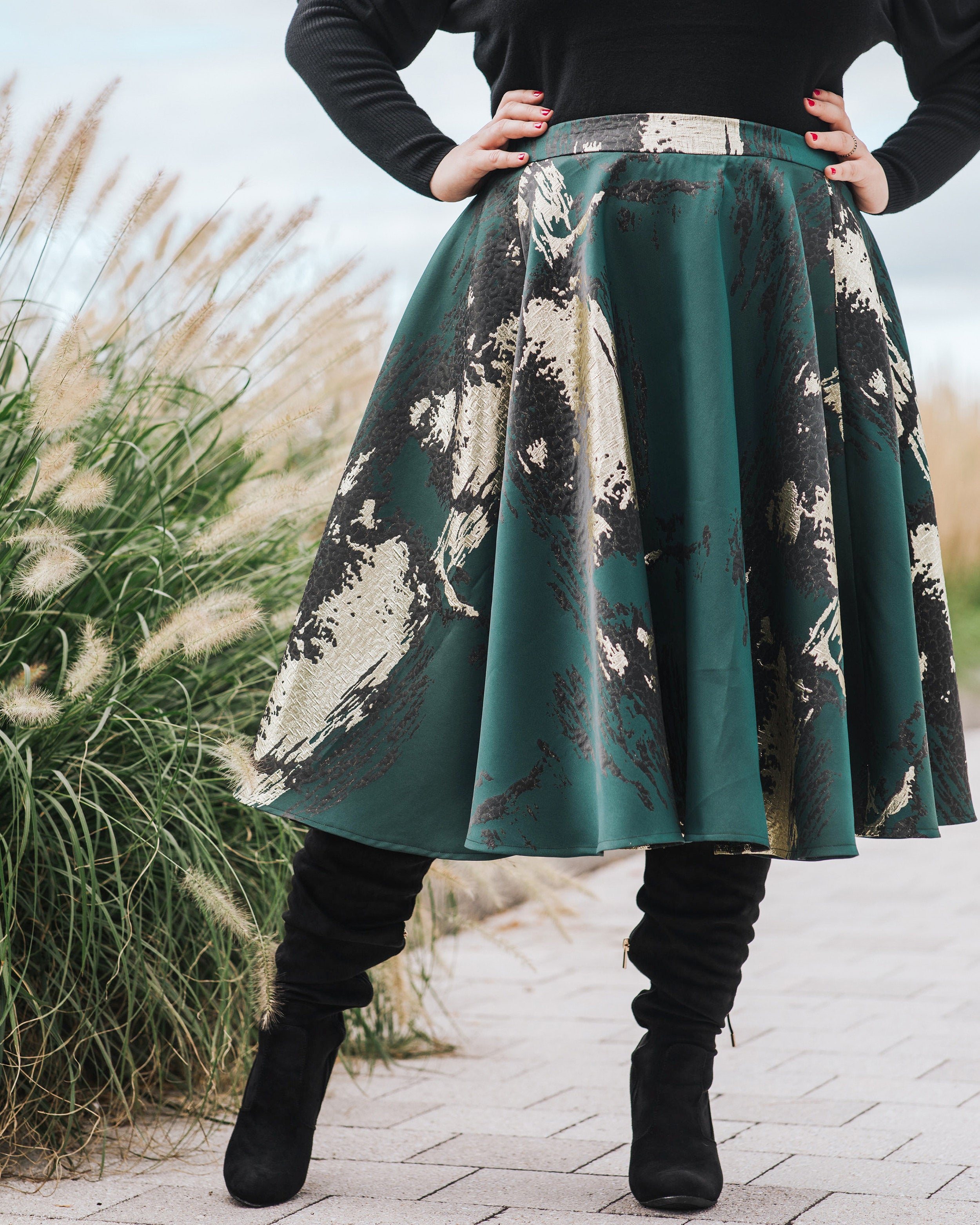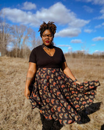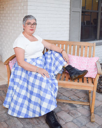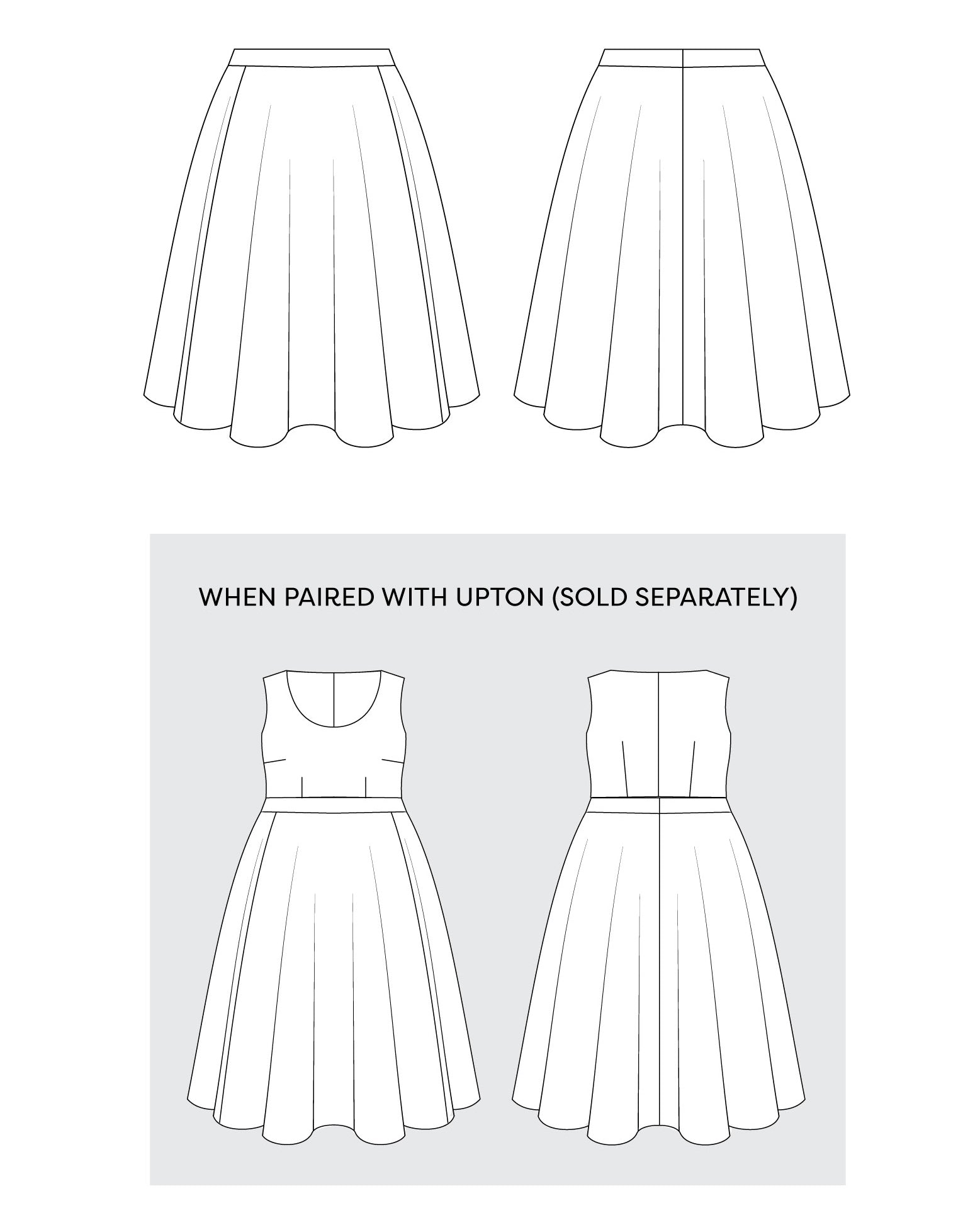 Versatile three-paneled circle skirt sewing pattern with a contoured waistband, which can be made on its own or used with the Upton Dress line bodice options!
