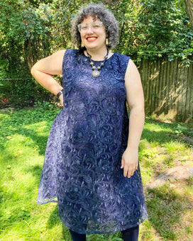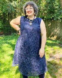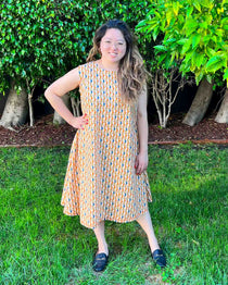 Woven swing dress sewing pattern with faced neckline, roomy pockets, and sleeveless or drop-sleeve options in cups C-H—perfect for beginners.