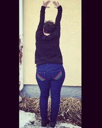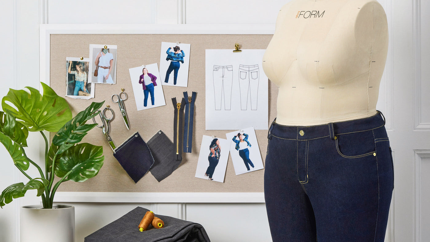 Customizable stretch jeans sewing pattern with skinny and straight legs, and apple and pear shaped pelvis fits.