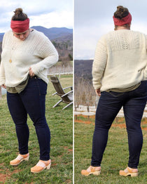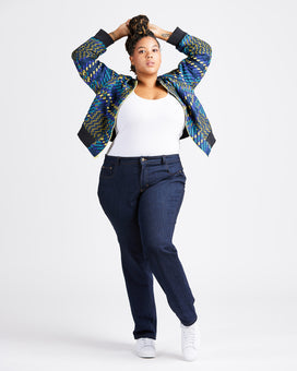 Make a date with denim in the classic and versatile Cashmerette Ames Jeans: stretch jeans exclusively designed for curves. When it comes to jeans, perfect fit is a must. Get the look you love by customizing your pattern using our interchangeable “apple” and “pear” pelvis pieces, and skinny and straight leg options. These 5-pocket wardrobe essentials are the real deal, with features like rivets, belt loops and a fly front. And hold the style together with a high rise, and a pocket stay for secret smooth shaping.