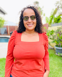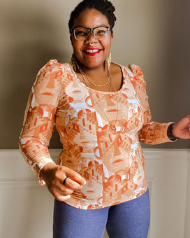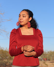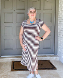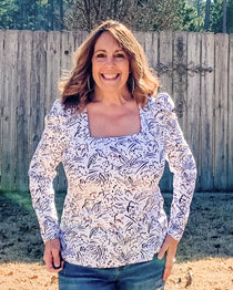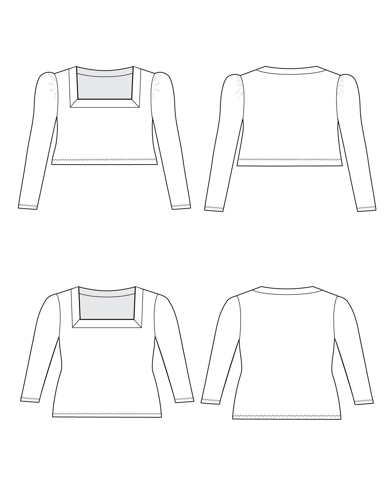 Elevated square neck tee sewing pattern with mitered neckband, and puff or straight sleeve. Mixes and matches with the Concord T-Shirt for over 80 combinations!