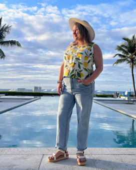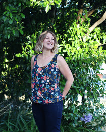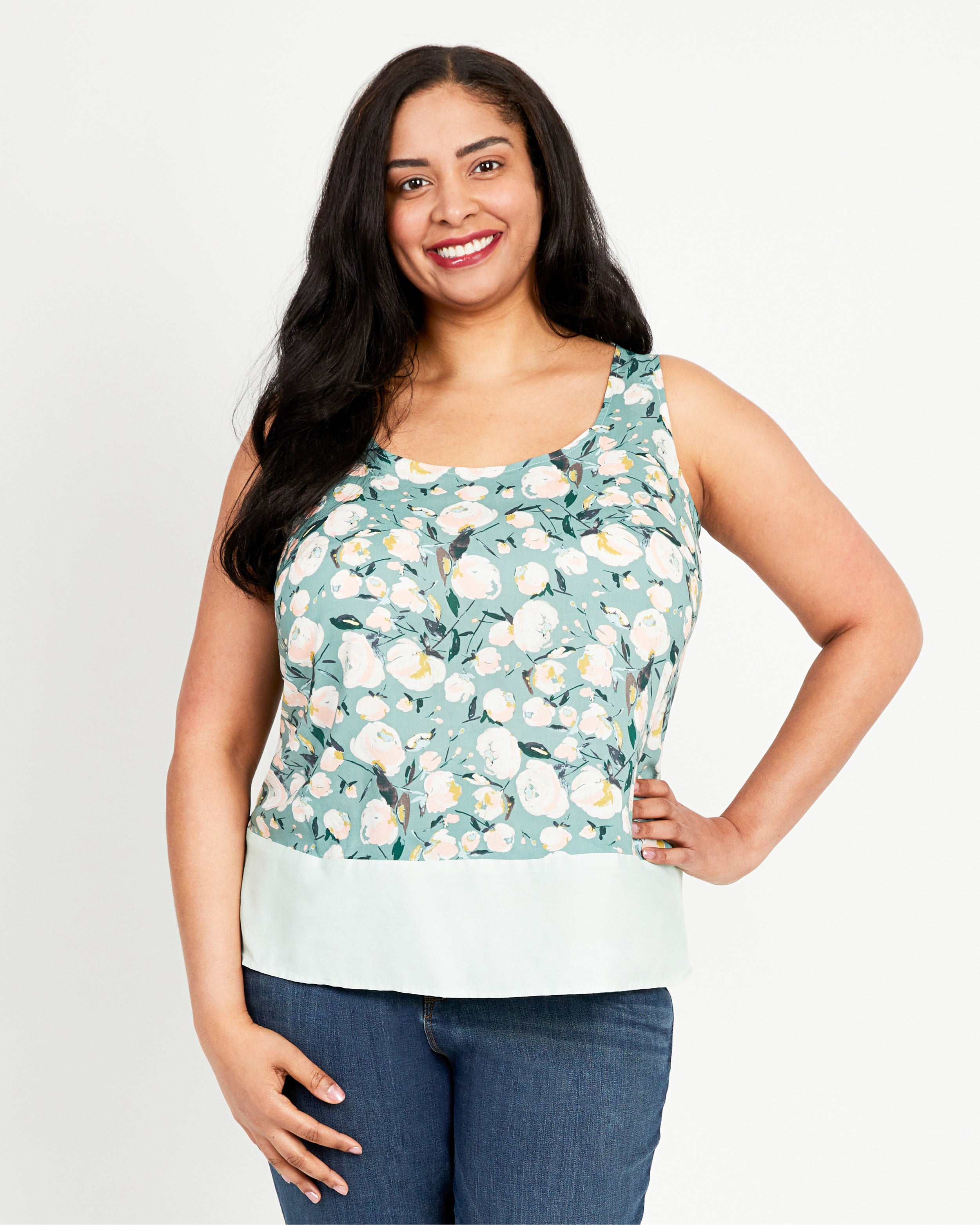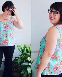 Essential woven shell top sewing pattern for big boobs in cup sizes C-H. Sleeveless design with bias bound scoop neckline and two back options.