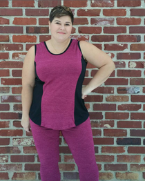 Sleek knit workout tank sewing pattern with princess seams in cups C-H. Choose from multiple neckline options including decorative back straps.