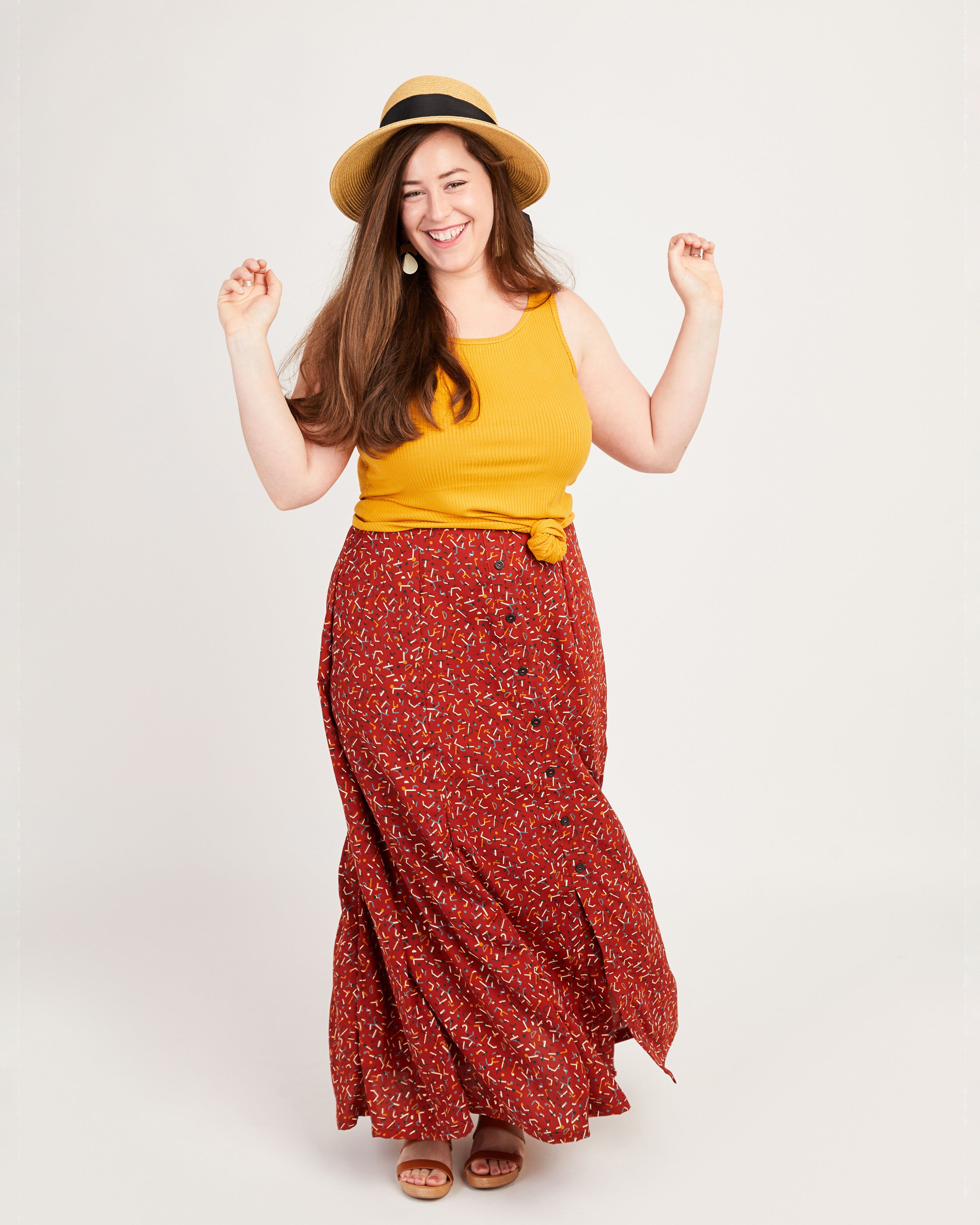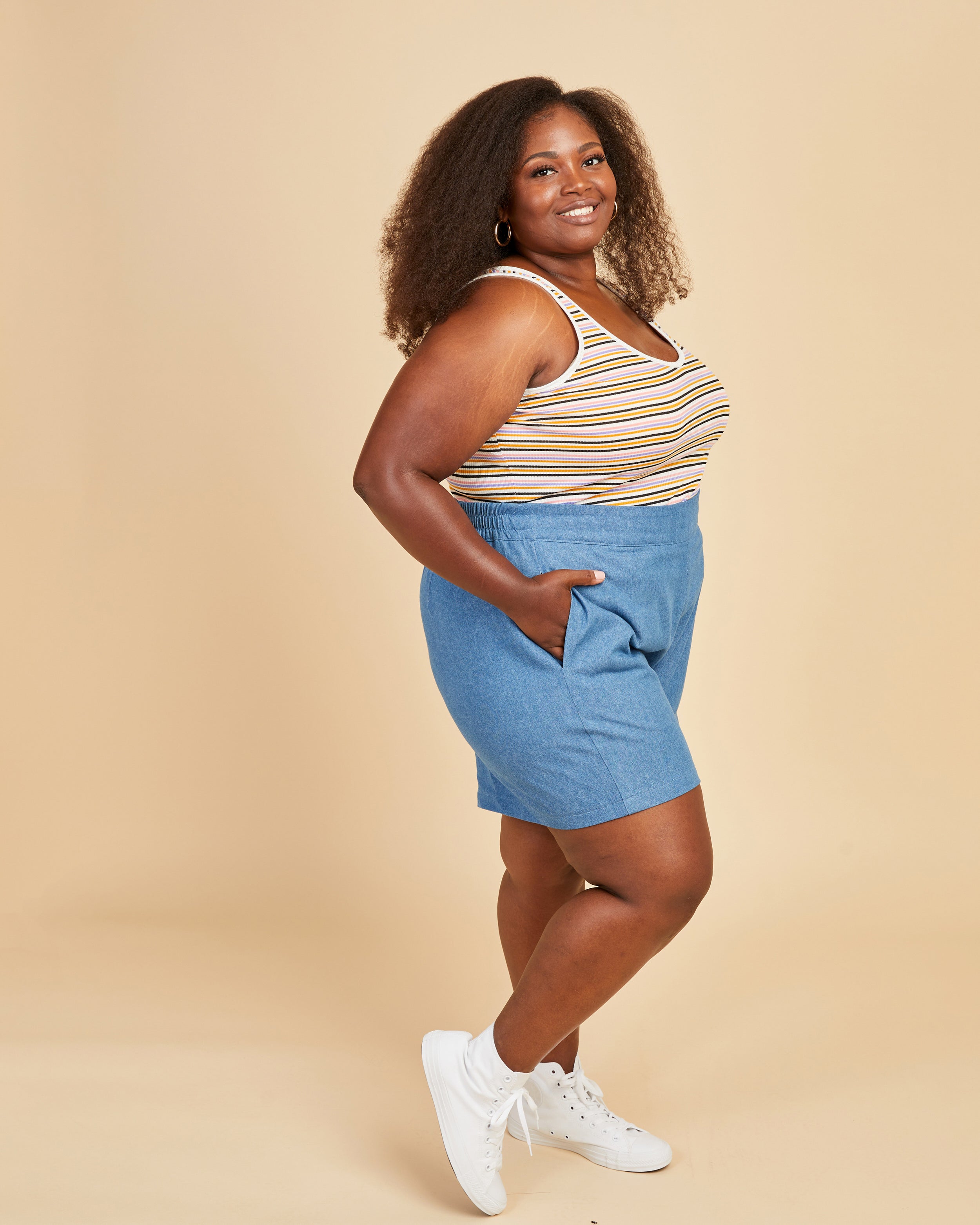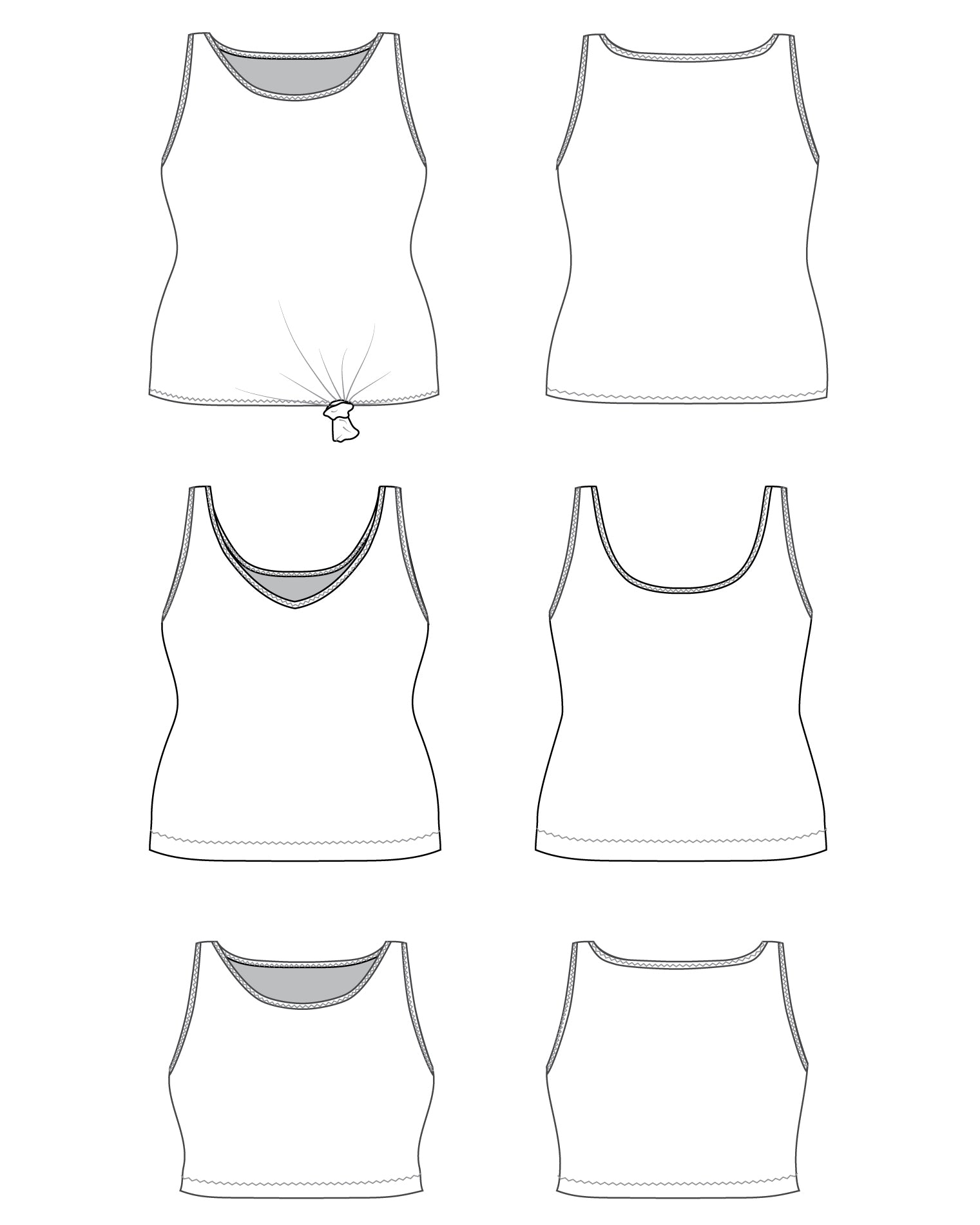 Bra-friendly knit tank sewing pattern in cup sizes C-H, with multiple neckline, length, and hem options.