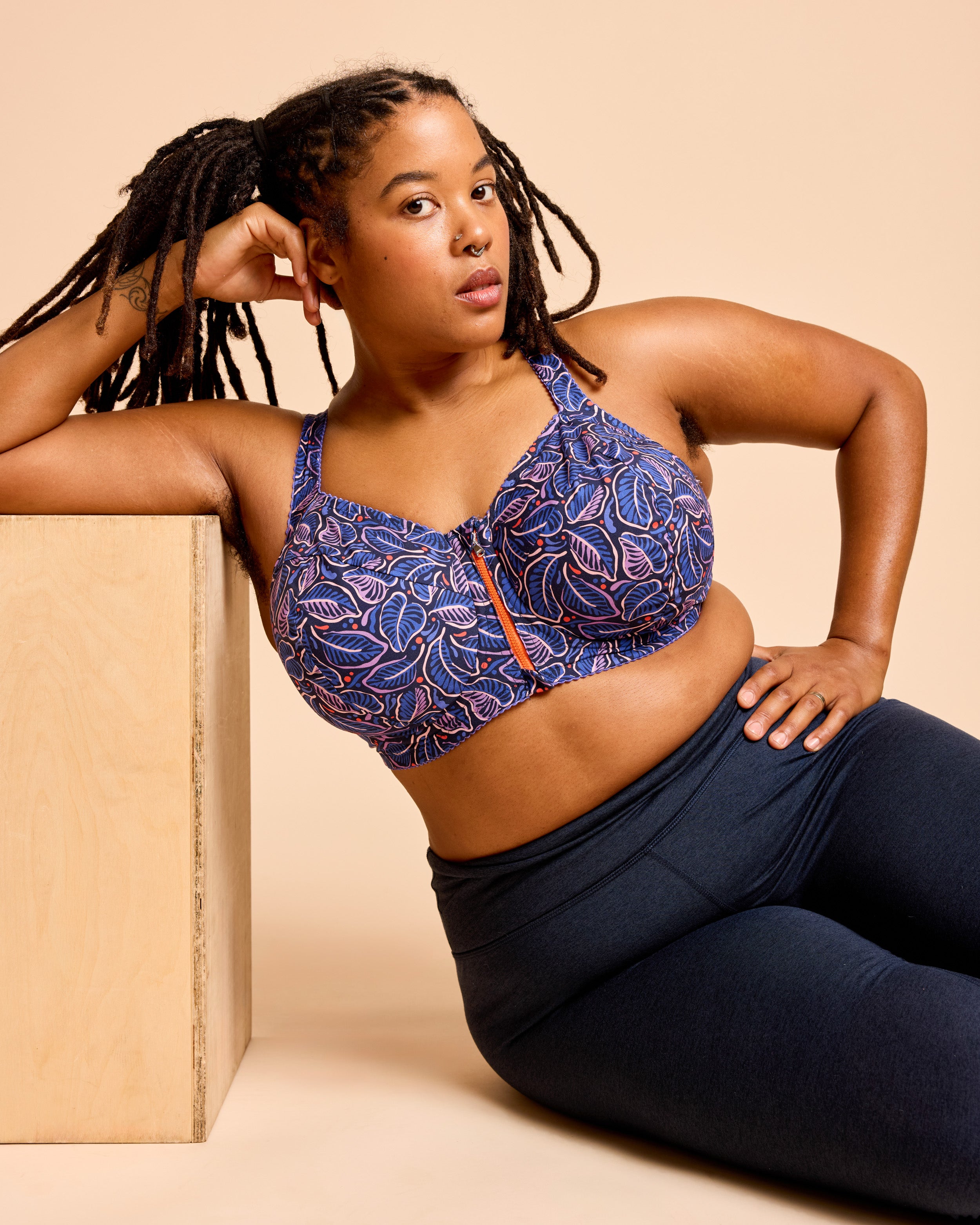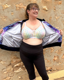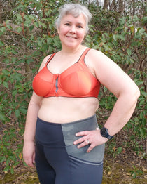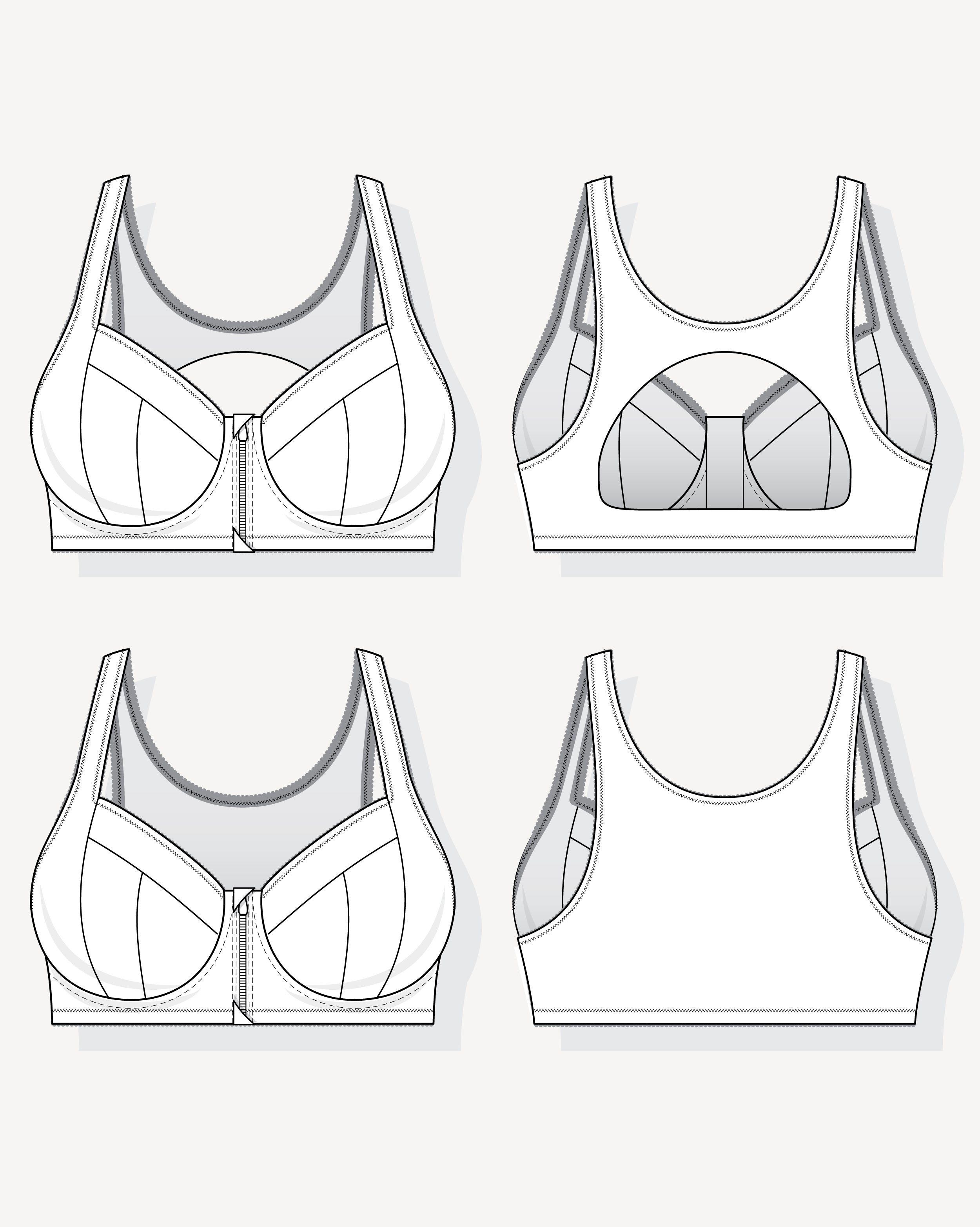 Underwire sports bra sewing pattern with front zipper, 4-piece cups, and two back options including sporty cut-out. Exceptional support in sizes 28C-54J. Free bra fitting ebook included!