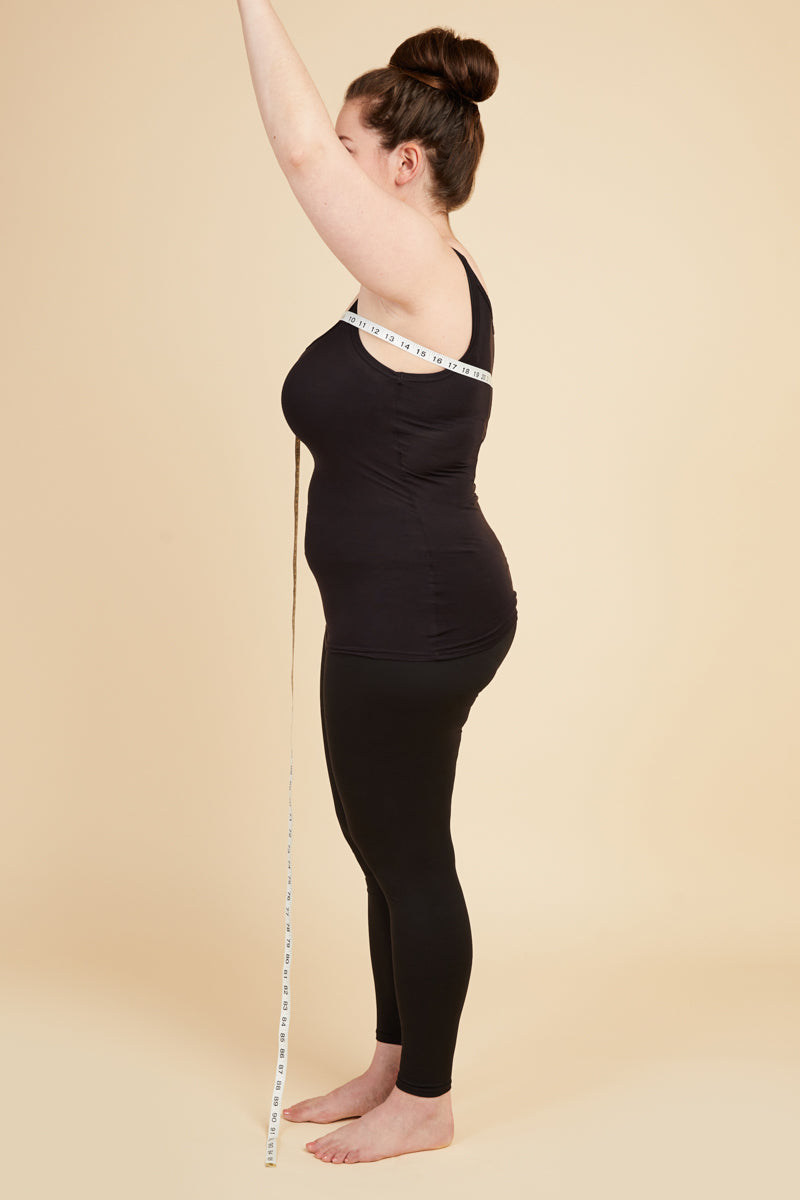Take this measurement while NOT wearing a bra. Place the measuring tape over the top of your bust and underneath your armpits. The tape will be horizontal at your back and front, and diagonal at your side. Keep your arms down when recording your high bust measurement.