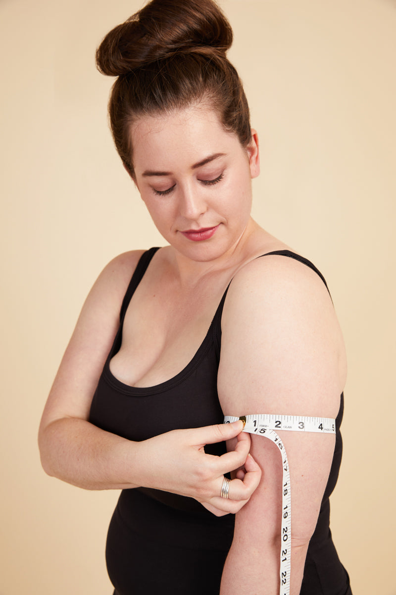 Place the measuring tape around your arm at armpit level, around the fullest part of your upper arm. Keep your arm down and relaxed while taking this measurement.