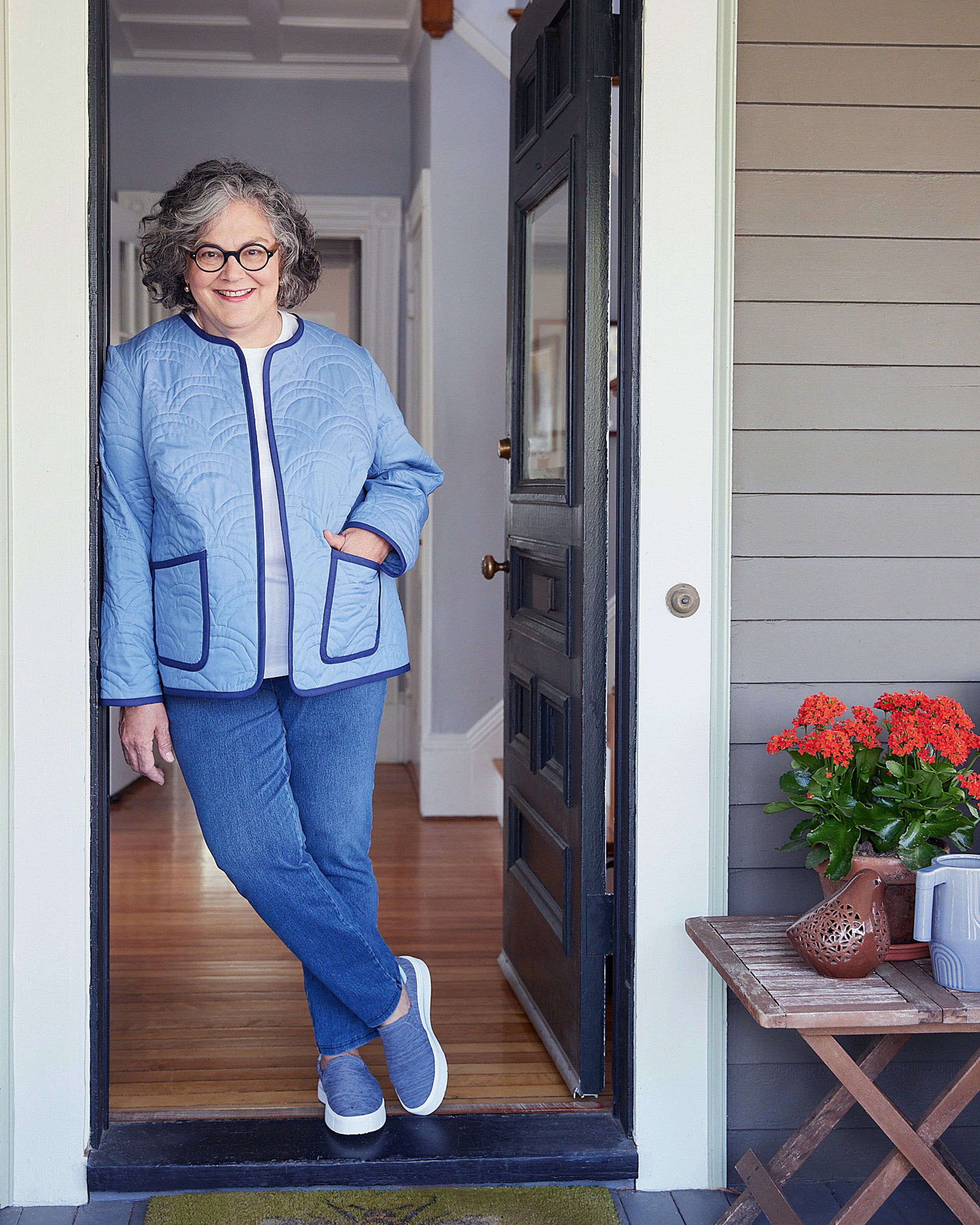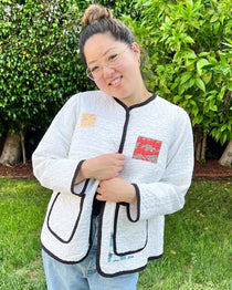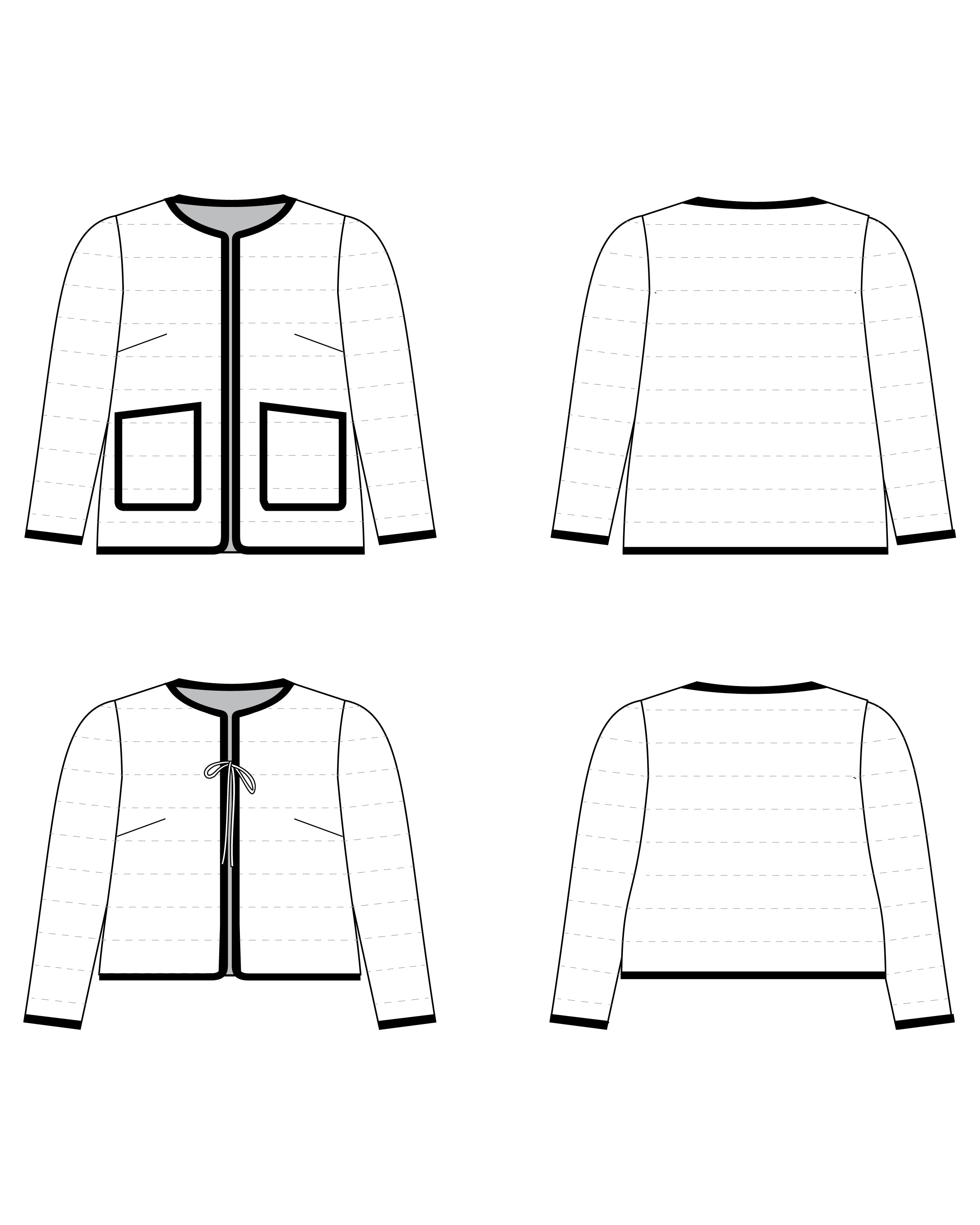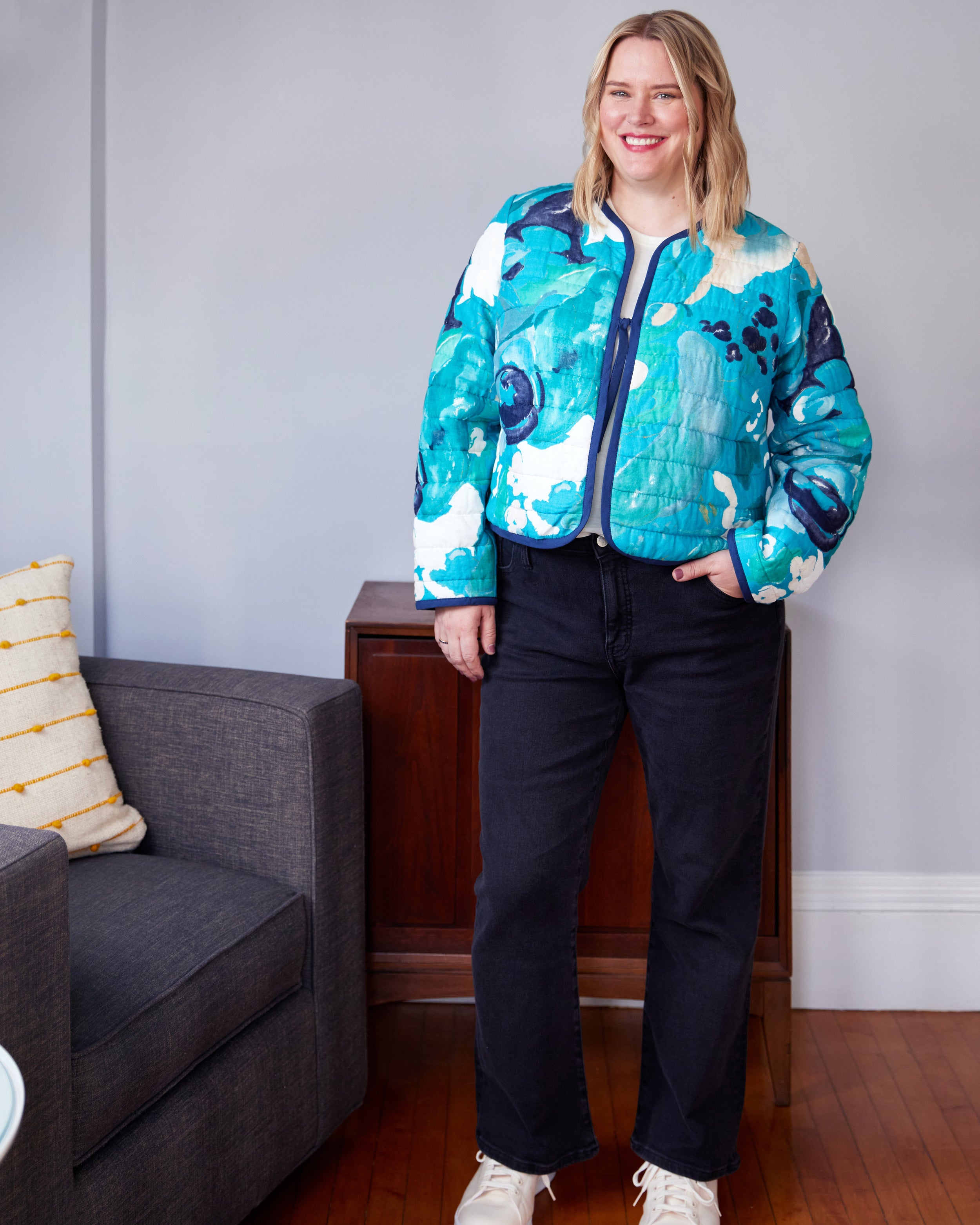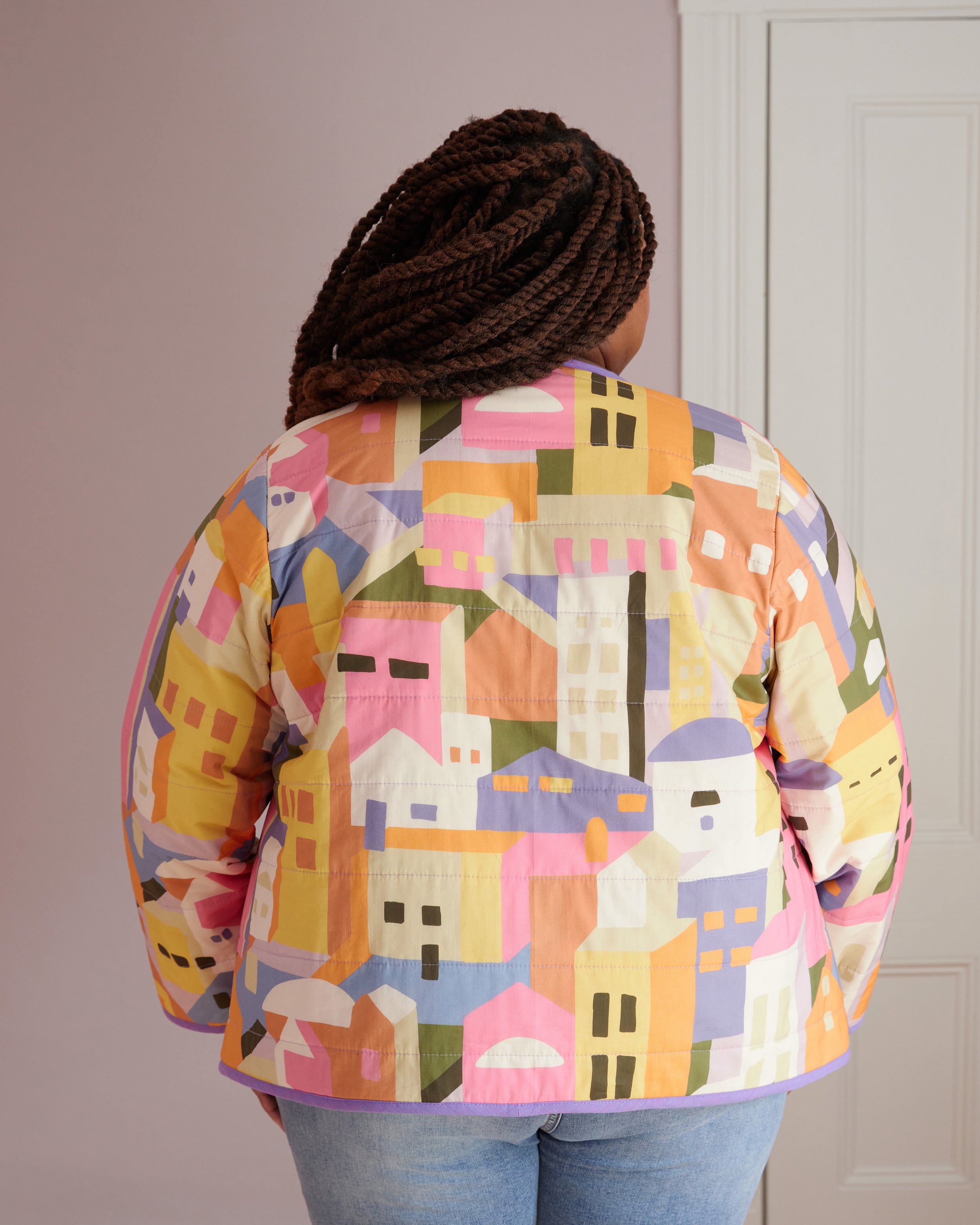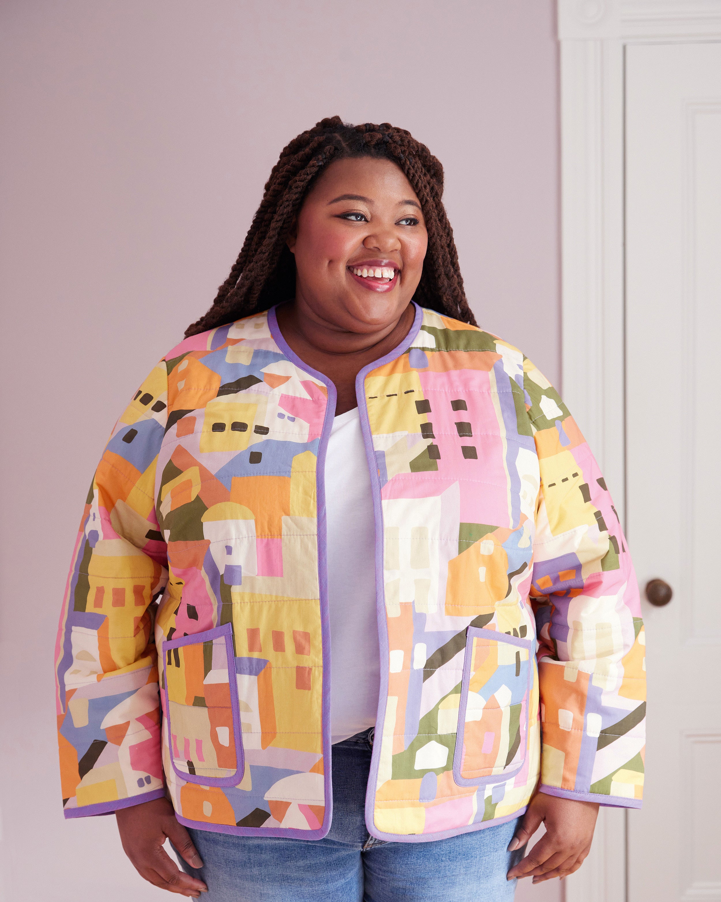 Beginner-friendly quilted jacket sewing pattern with bust shaping in cups C-H. Use pre-quilted fabric, or quilt your own—we show you how!