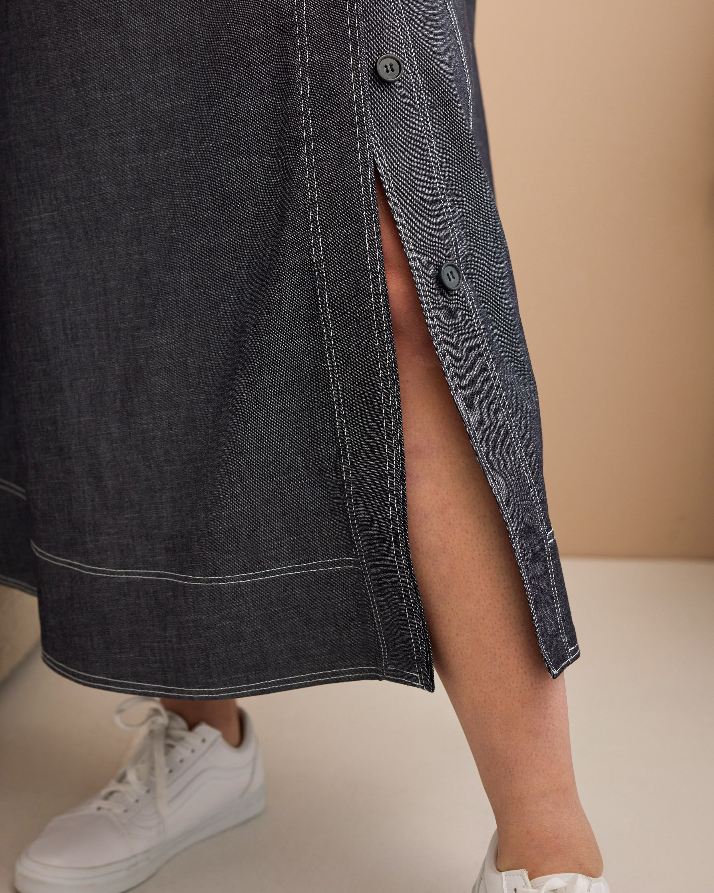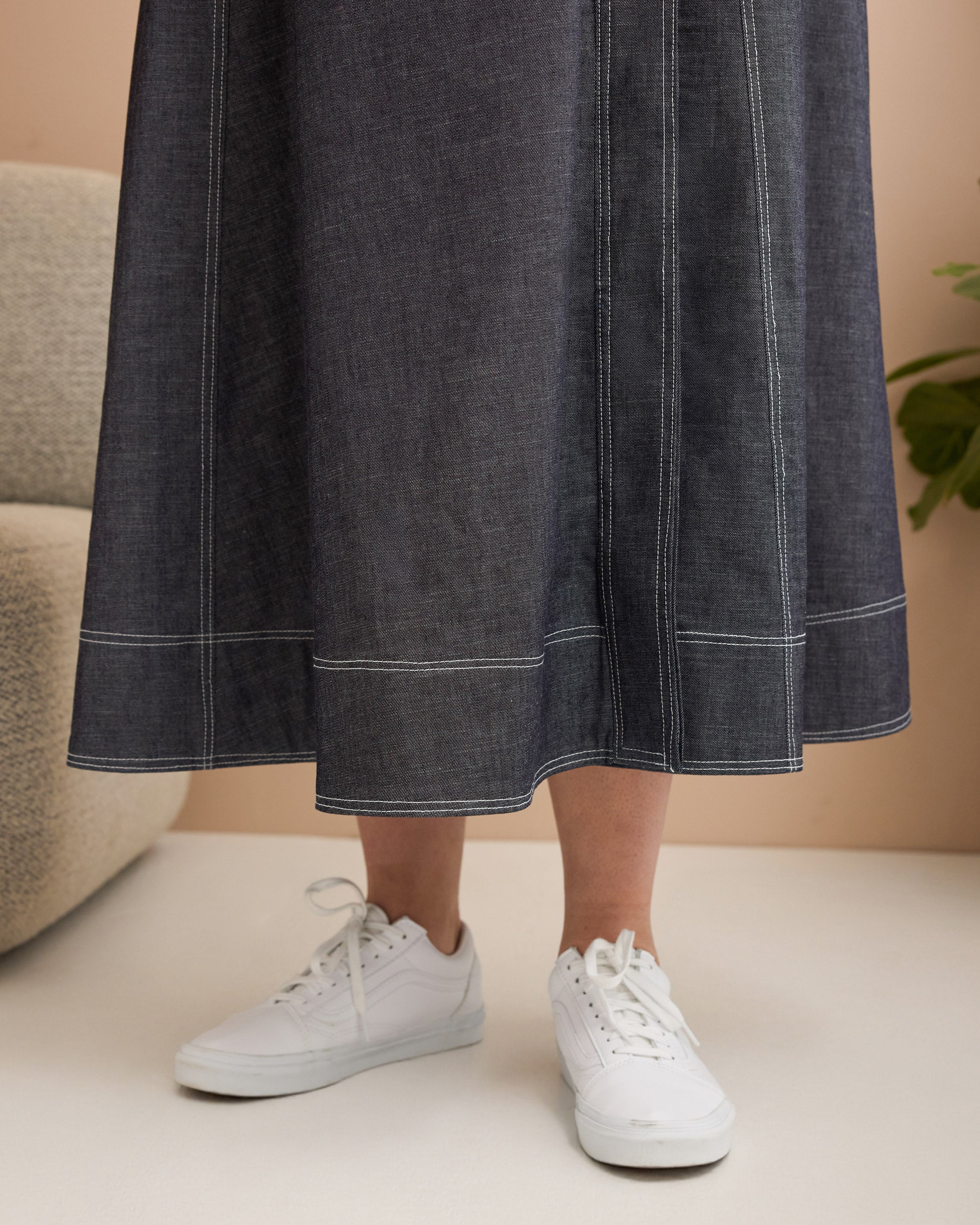Say hello to the Osgood, a skirt designed to go everywhere. It's an A-line midi with a twist: an adjustable side slit that lets you choose your look via a hidden button placket. Bold topstitching and a decorative waistband belt with slider give it sophisticated polish, while deep pockets and a back elastic panel keep it practical and comfortable.
