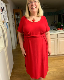 Super-wearable t-shirt dress sewing pattern with options for length, necklines, sleeves and waist tie in cups C-H.